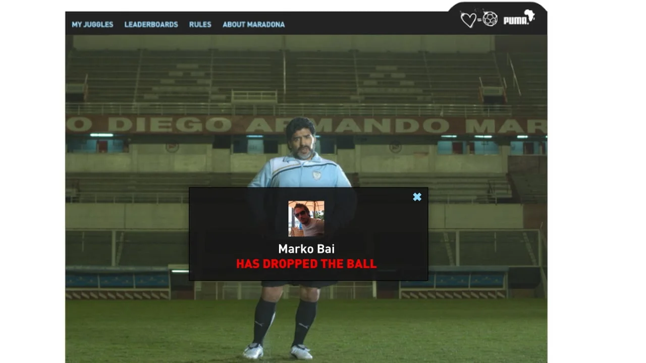 In celebration of Diego Maradona’s 50th birthday, we helped PUMA create the world’s biggest juggling game on Facebook. Users pass on video footage of Maradona’s breathtaking juggling skills to a new friend every 30 minutes, the video had to keep getting passed or else the ball would drop. The longer a juggle lasted, the greater players’ chances were of winning signed gear from PUMA’s limited-edition King Diego line.